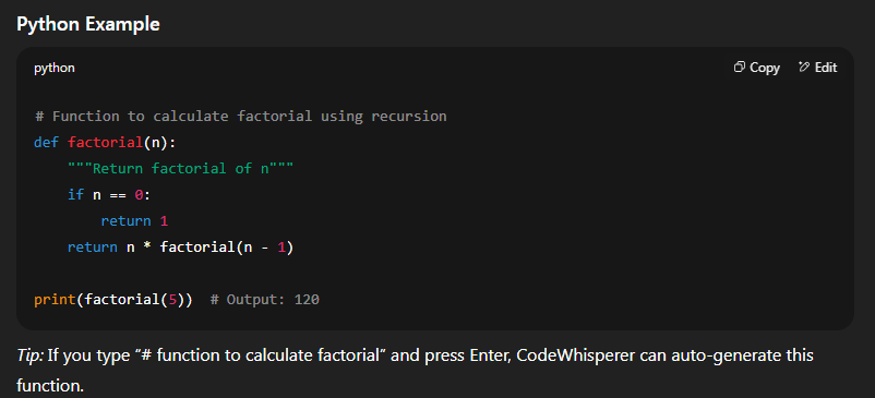 - Customizable Prompts – Fine-tune how CodeWhisperer responds to your instructions.
